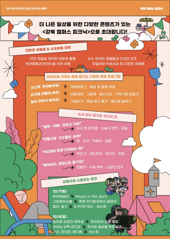 "로컬 커뮤니티와 함께, 일상을 피크닉으로 새롭게”를 슬로건으로 내건 <강북 캠퍼스 피크닉>은 10월 7일(토)부터 8일(일)까지 이틀간 한신대학교 서울캠퍼스에서 시민을 대상으로 하는 지역축제가 개최된다고 합니다.소풍을 가듯, 캠핑을 떠나듯 도심 속 일상에 지친 사람에게 휴식과 여유를, 남녀노소 누구나 즐기는 재미난 공연과 체험을, 맛있는 먹거리와 풍성한 볼거리를 제공한다.