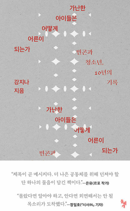 가난이 주인공 자리를 꿰찬 삶은 피로하다. 아이들은 성장의 기쁨을 느낄 새도 없이 조로한다. ‘다음’을 계획하기 어려운 삶에서 체념은 생존 전략이자 지혜가 된다. 저자는 그들의 말과 말 사이를 방황하며 깨닫는다. 이들의 이야기가 공동체를 위한 중요한 증언이자 폭로임을. 누군가에게는 선진국일 한국사회가 짜놓은 교육·노동·복지의 그물이 얼마나 성기고 낡았는지를. 숫자나 통계가 아니라 구체적인 이름과 목소리가 주는 통증을 성실하게 기록했다. 몰랐다면 알아야 하고, 안다면 외면해서는 안 될 목소리가 도착했다.