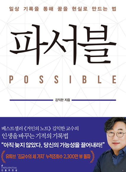 성장에 대한 욕구를 가진 사람들이 ‘기록형 인간’으로 거듭날 요량으로 해가 바뀌면 다이어리와 노트를 사고 열심히 기록하는 습관을 들여 보지만 잘되지 않아 괴로워한다. 《파서블》은 성과를 내는 일상 기록법을 알려주는 책이다. 꿈이나 목표가 있다면 일상 기록을 통해 그 가능성을 현실로 만드는 전략이 담겨 있다. 김익한 교수는 책에서 일상 기록 방법을 하루, 일주일, 한 달을 기점으로 체계화해 알려준다. 그동안 기록을 생각의 도구로 활용할 줄 몰라서 무작정 쓰거나 어디서부터 어떻게 기록해야 할지 몰라서 망설이는 이들에게 이 책이 방향타가 되어준다.