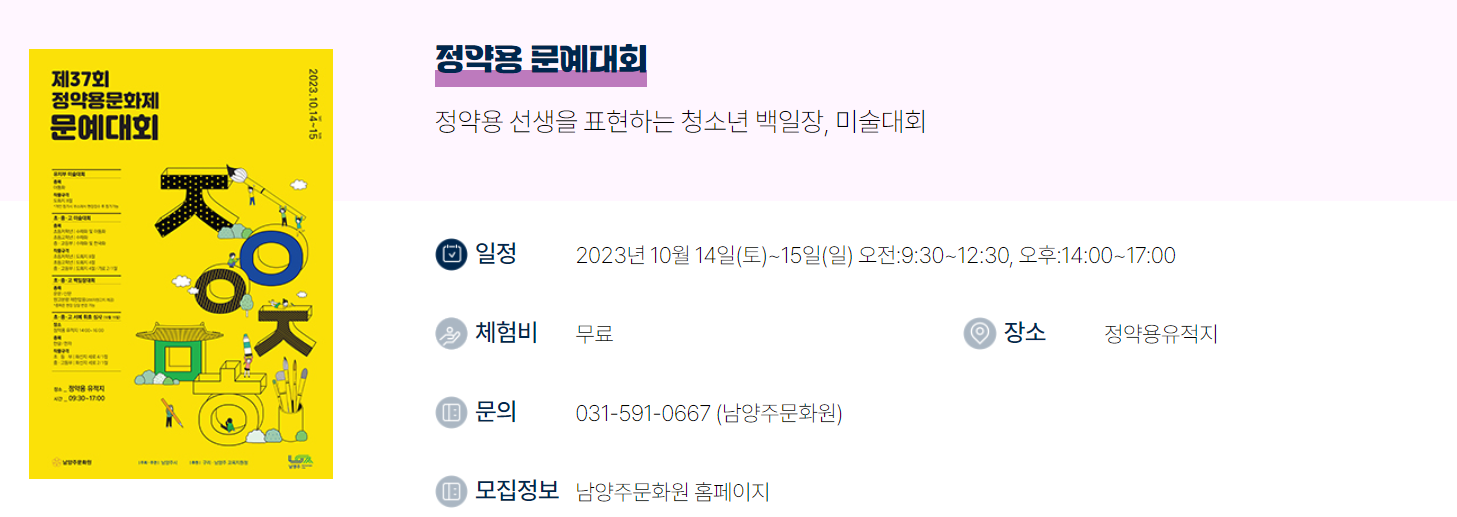 유네스코가 선정한 세계기념인물인 정약용 선생님의 실사구시와 인문정신을 현대적으로 계승하고자 1986년부터 계속된 남양주시의 대표 축제입니다. 정약용 선생이 나고 자란 여유당 생가와 묘소, 문화관과 기념관이 자리한 정약용유적지와 다산생태공원 일원에서 펼쳐지는 정약용문화제에서 인문의 향기와 실학의 품격에 젖어 보시기 바랍니다.