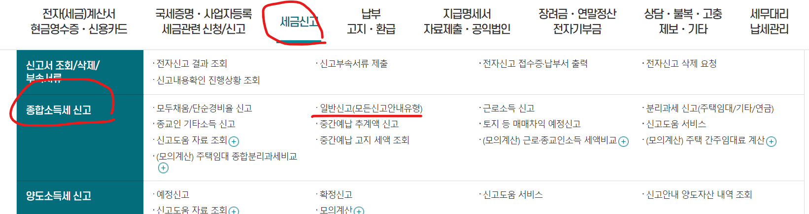 홈페이지 들어간 이후 홈에서 세금신고 카테고리 / 종합소득세 신고 카테고리 란에 일반신고란을 클릭을 해주십시오.