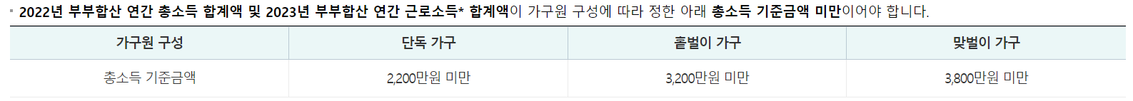 2022년 부부합산 연간 총소득 합계액 및 2023년 부부합산 연간 근로소득* 합계액이 가구원 구성에 따라 정한 아래 총소득 기준금액 미만이어야 합니다.