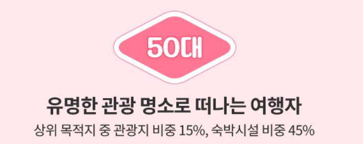 50대에게는 전주한옥마을, 순천만국가정원, 인터컨티넨탈 호텔, 경주 보문단지가 추천장소로 꼽히고 있습니다. 50대답게 한적한 자연과 어울리는 곳이 추천지가 되는거 아닌가 싶습니다.